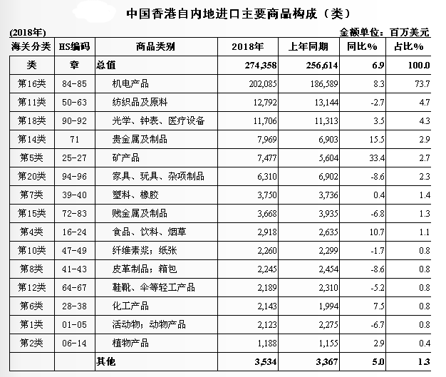 2018年,中国内地对外出口商品约为2.48万亿美元,其中出口香港2743.6亿美元,占比大于11%。香港不过七百多万人口,面积一千平方公里,撑破肚皮也消化不了内地11%的出口。